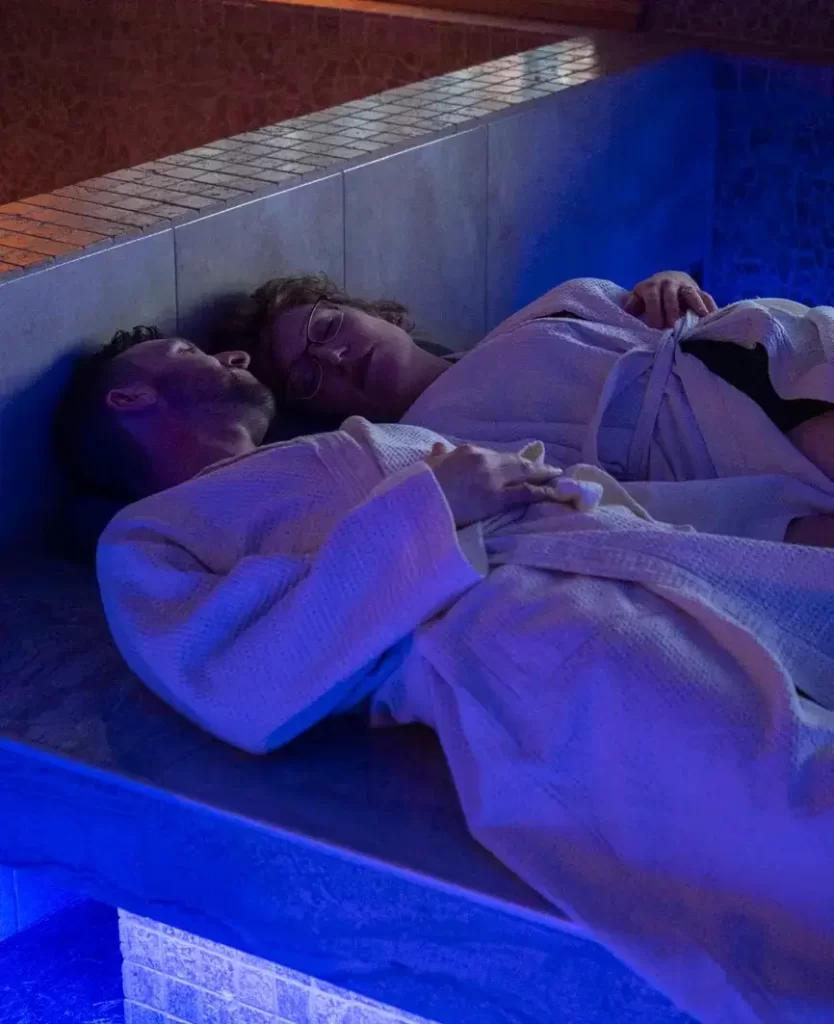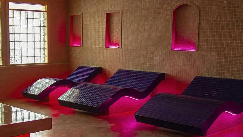 This room features chairs that are contoured to your body to provide soothing relief to any sore spots that are in contact with the heated tiles. Lay your towel over a chair and stretch out for a uniquely relaxing experience. This floor is a “no-talking” zone, and this relaxation room is meant to encourage deep rest (and perhaps even a nap!) in an undisturbed environment. Choose one of our single chairs or, if you are a couple who wants to rest together, one of our double chairs. We also feature two heated “double beds”, a hammam-style feature that allows you to lay flat on the large and heated ceramic tiles.