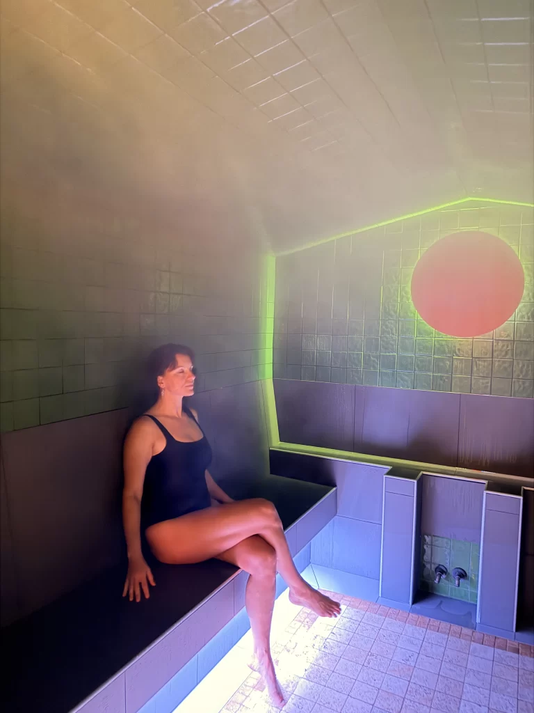 The two cedar saunas are separated by an illuminated Himalayan salt wall. The warm sauna is set at 60°C (140°F) and the hot sauna at 80° C (176°F). There are rinsing showers located close by for cleansing after your sauna. Extra-long absorbent Turkish towels for sitting on the sauna benches are available to rent at the front desk. In winter, check out the snow rolling area to cool down after your sauna.